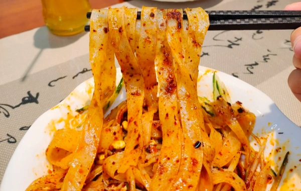 Liangpi (“cold skin noodles”) are a refreshing summer staple made from wheat or rice flour. The noodles are steamed, sliced into thin strips, and served cold with a zingy sauce of vinegar, garlic, chili oil, and sesame paste, topped with cucumbers, bean sprouts, and cilantro.