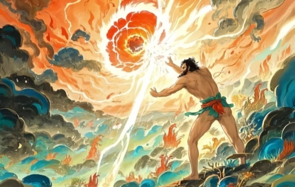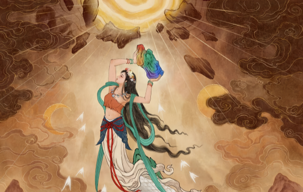 • Nüwa Creates Humans: Nüwa shapes humans from yellow clay, later switching to flicking mud with a vine due to exhaustion, explaining social hierarchies (hand-molded elites vs. vine-flung commoners). This reflects matrilineal reverence for female fertility.