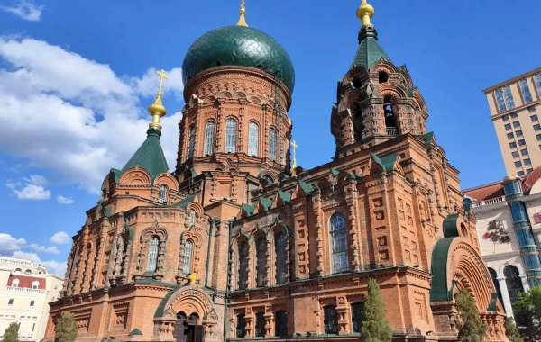 Потом мы подошли к историческому зданию Харбина, Собор Святой Софии. Эта церковь в стиле барокко привлекает бесчисленных туристов своим великолепным внешним видом и великолепным внутренним убранством. Зимой церковь покрыта снегом, что делает ее особенно торжественной и священной.